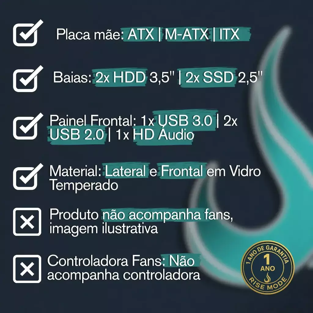 - Suporte Fans: Inferior (3x120mm), Superior (3x120mm), Traseira (1x120mm), Lateral (3x120mm)