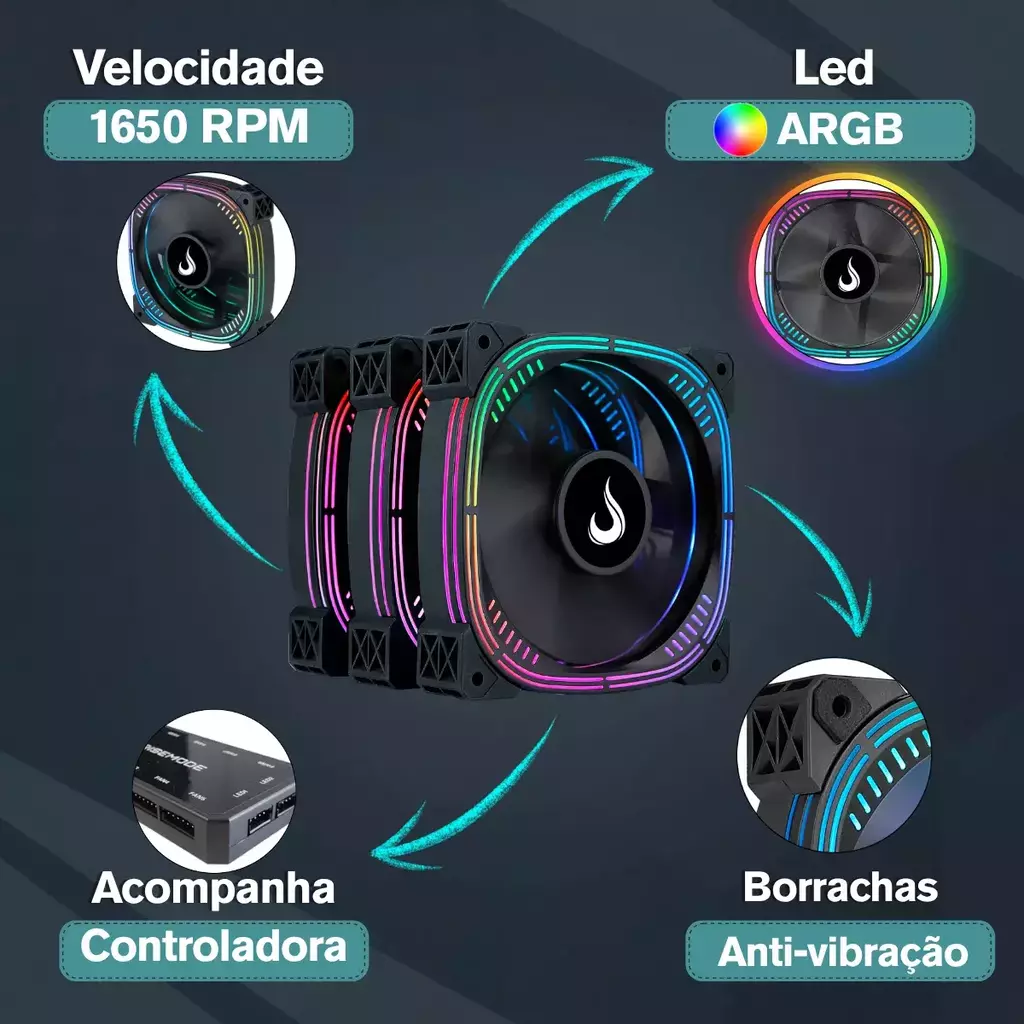 O Kit Fans Rise Mode Aura Pro Black ARGB 5v oferece uma combinação poderosa de eficiência de refrigeração e iluminação impressionante. Cada fan tem um fluxo de ar de 50 CFM e opera a uma velocidade de 1650 RPM, garantindo o resfriamento eficiente do seu sistema. Equipado com LEDs ARGB de alto brilho, este kit transformará o seu setup em um espetáculo de luzes, facilmente controlável por meio de um controle remoto. Acompanha uma controladora ARGB que suporta até 10 fans, fazendo deste kit a escolha ideal para quem busca performance e estilo. O rolamento de fluido assegura um funcionamento silencioso, com um nível de ruído de apenas 25 dBA.