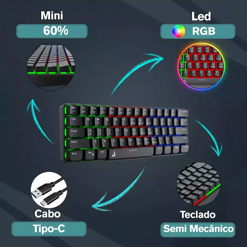 - Layout 60% compacto: Ideal para setups minimalistas e com pouco espaço na mesa. Mantenha o mouse e mousepad com mais folga para movimentos amplos durante o jogo.