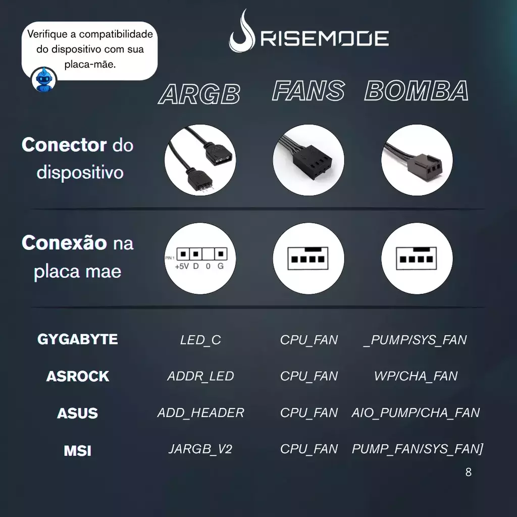 - Conexão Bomba: 3 pin (AIO_PUMP)