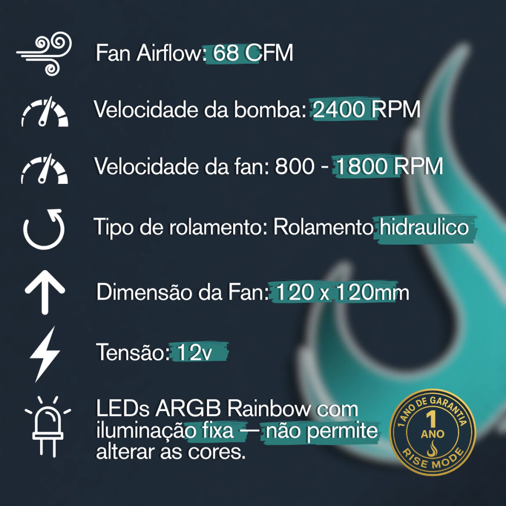 - Cor do Led: Rainbow (Os Leds da Bomba e das fans não é possível alterar as cores)
