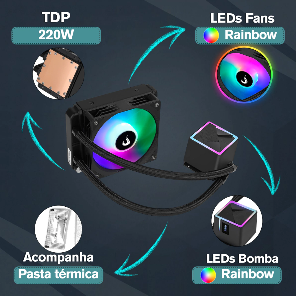 O Water Cooler Rise Mode Black 120mm Rainbow oferece excelente resfriamento para processadores de até 220W de TDP, com fan de 120mm (800–1800 RPM), operação silenciosa de apenas 23dB(A) e rolamento hidráulico de longa duração. Possui iluminação Rainbow fixa na bomba e no fan — não permite alteração de cores. Compatível com diversos sockets Intel e AMD, é ideal para builds gamers que buscam performance e visual.