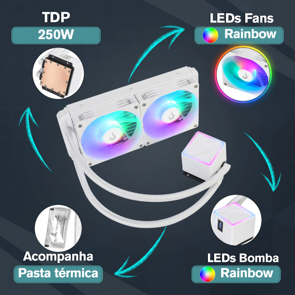 - Cor do Led: Rainbow (Os Leds da Bomba e das fans não é possível alterar as cores)